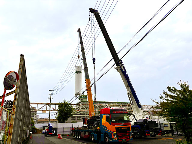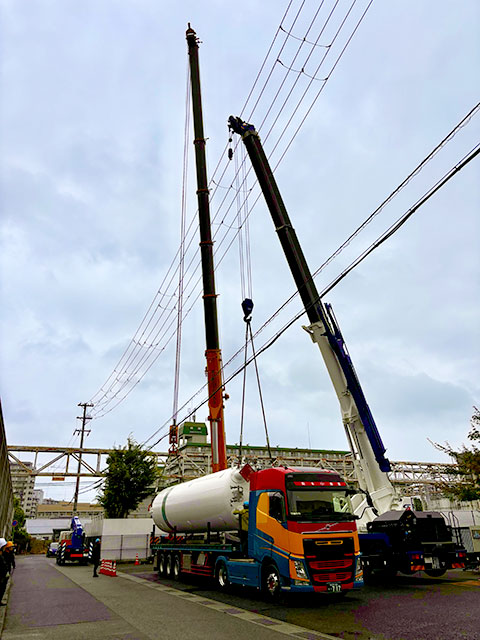 西宮市で液化炭酸ガス大型タンクの撤去作業を行いました。オールテレーンクレーン250tとラフタークレーン70tによる相吊り作業です。