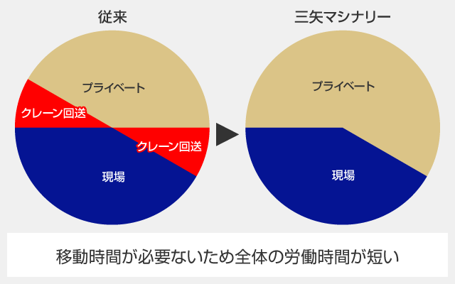 三矢マシナリーでは、会社と現場をクレーン車で往復する移動時間が必要がありません。