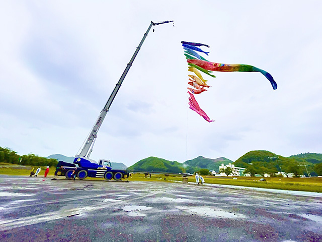 子どもたちの将来の夢を書き込んでもらったこいのぼり18匹を、弊社クレーンで高さ50メートルまで吊り上げました。
