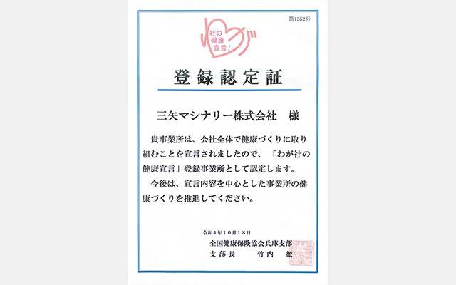 三矢マシナリーでは、自社の健康づくりを推進するあたり、会社全体で健康づくりに取り組むことを宣言し、