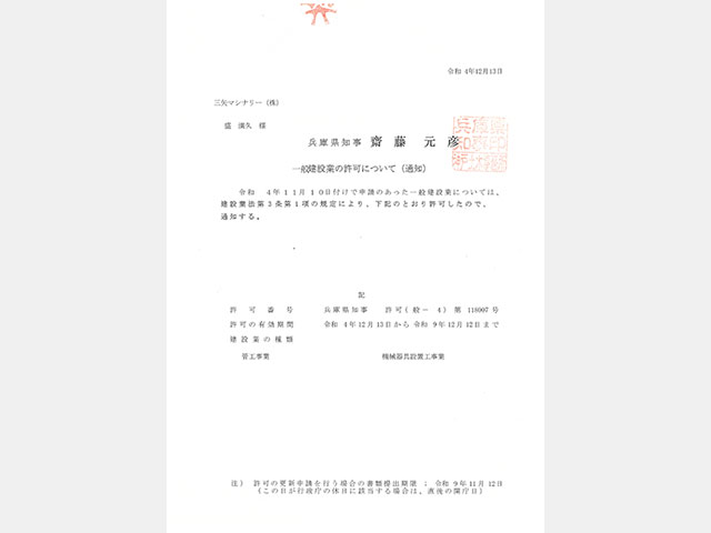 三矢マシナリーでは、既に取得している一般建設業許可の種類「とび・土工工事業」に加えて、このたび2022年12月13日付で「管工事業」「機械器具設置工事業」の許可を新たに取得いたしました。